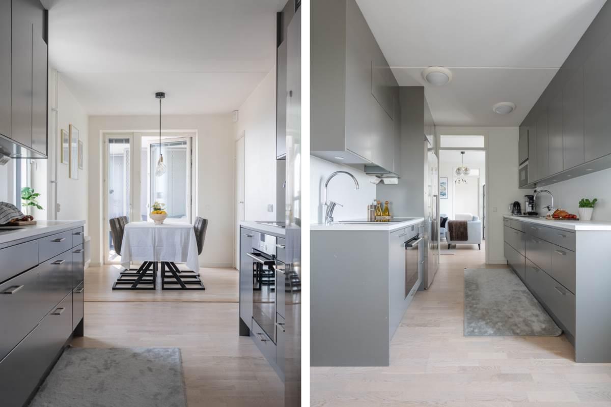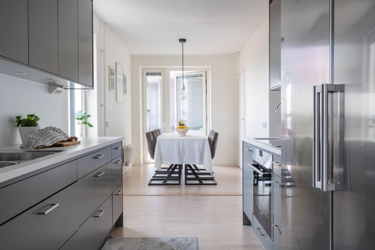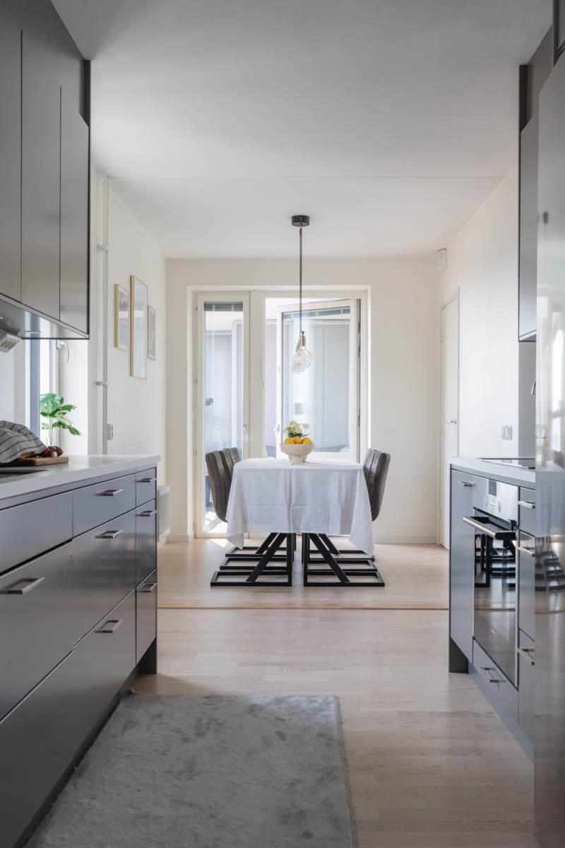 Köket ligger separat, vilket ger en tydlig uppdelning mellan matlagning och umgänge. Här finns goda arbetsytor, förvaring bakom ljusa skåpluckor samt fullstor kyl och frys. Matplatsen rymmer flera personer och har utgång till en av bostadens två balkonger – perfekt för morgonkaffet i solen.