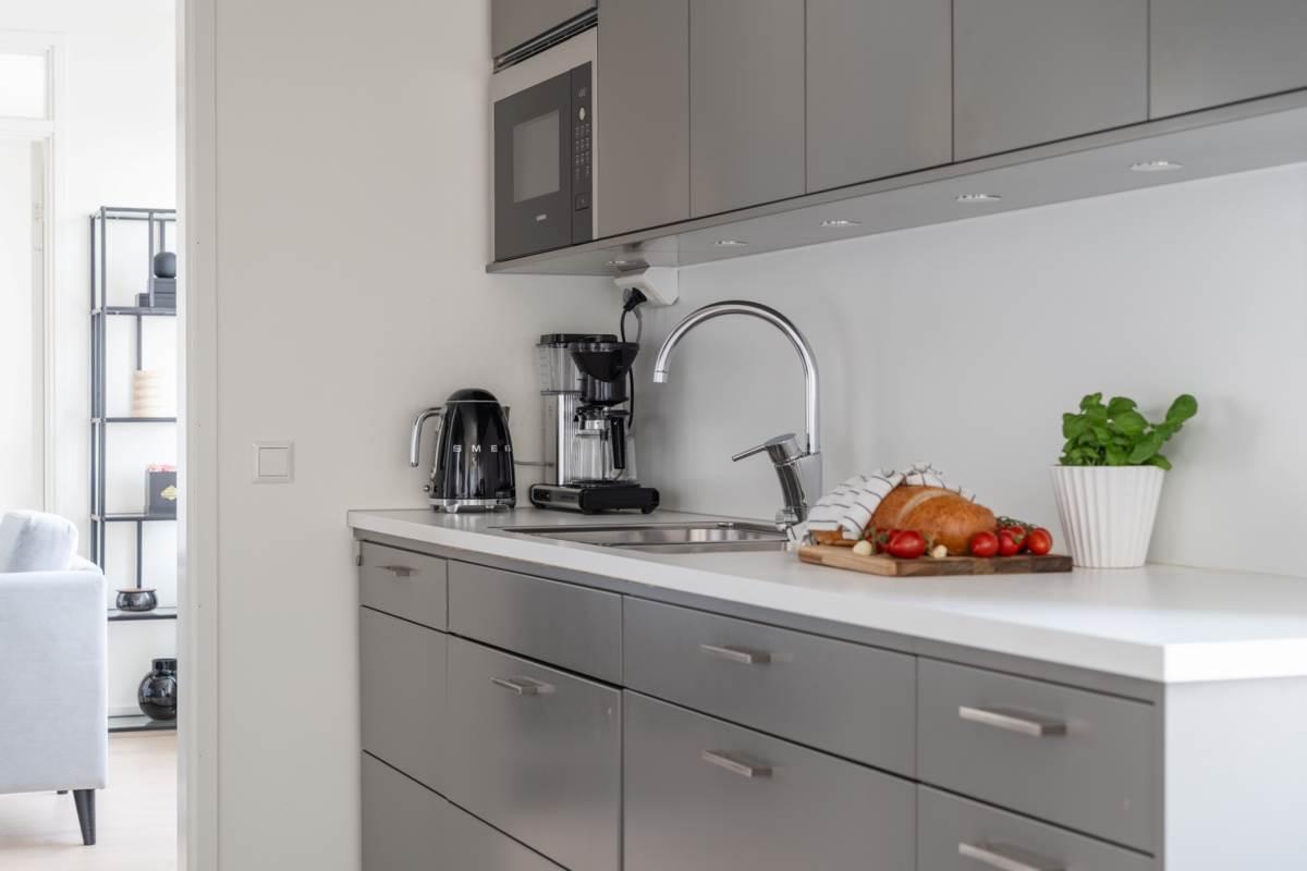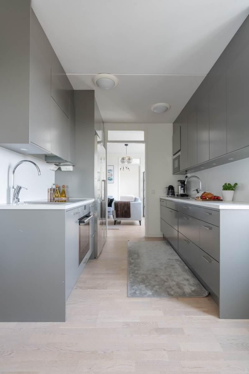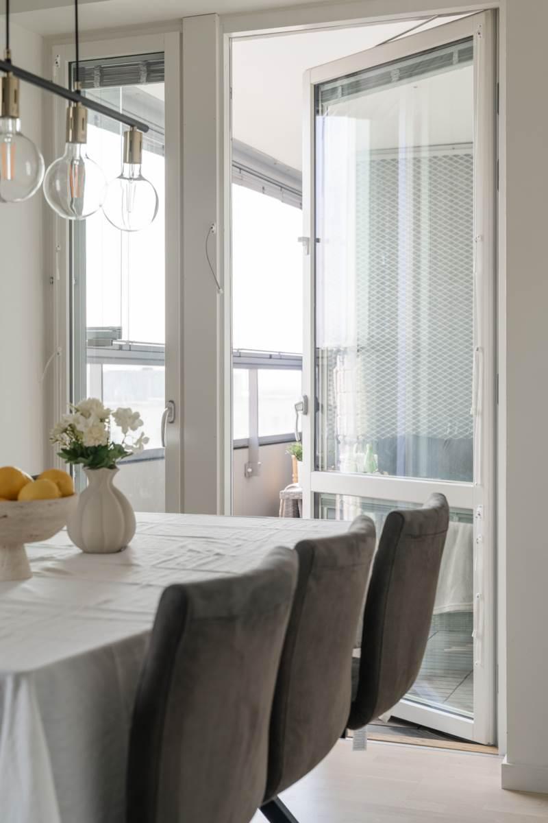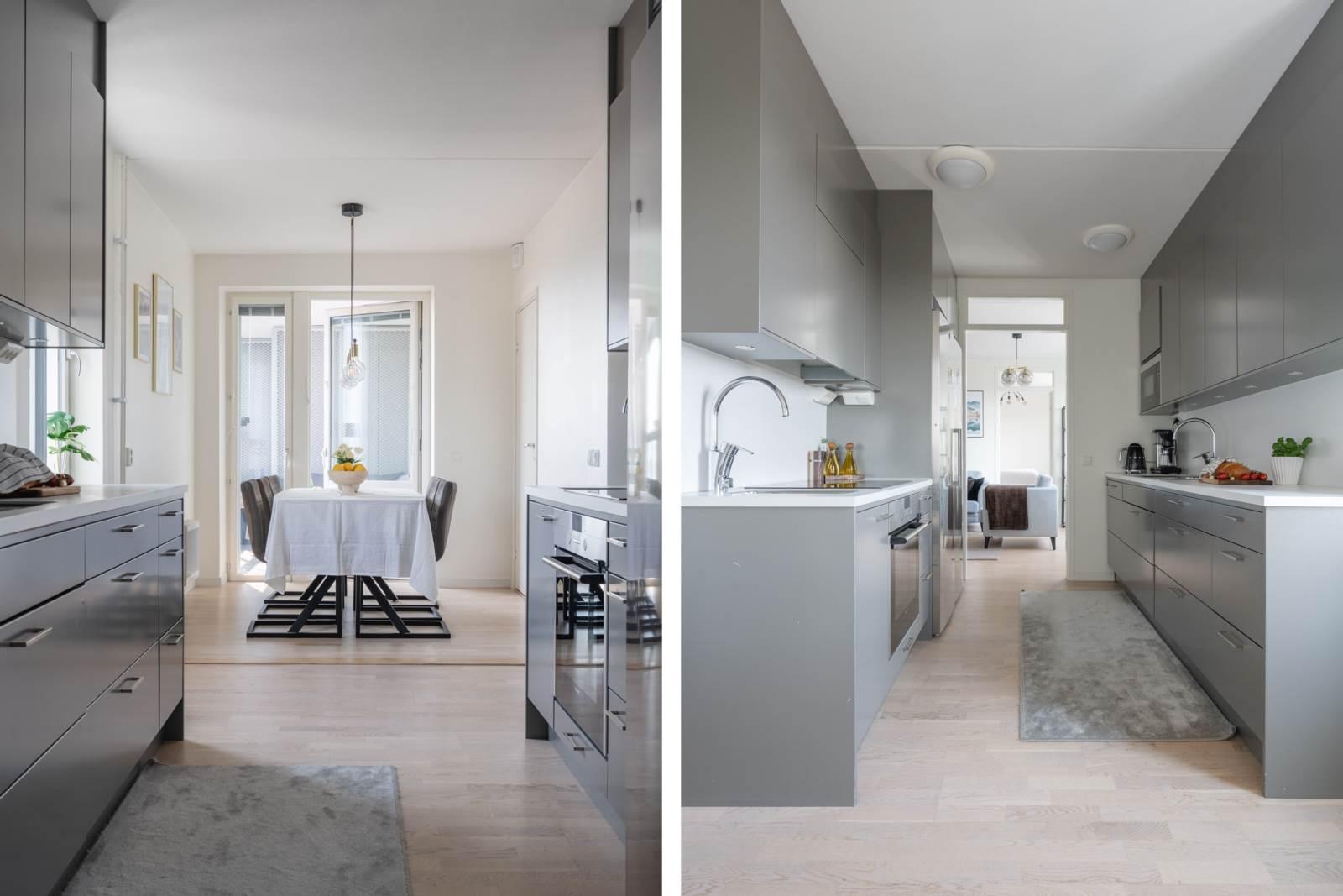 Köket ligger separat, vilket ger en tydlig uppdelning mellan matlagning och umgänge. Här finns goda arbetsytor, förvaring bakom ljusa skåpluckor samt fullstor kyl och frys. Matplatsen rymmer flera personer och har utgång till en av bostadens två balkonger – perfekt för morgonkaffet i solen.