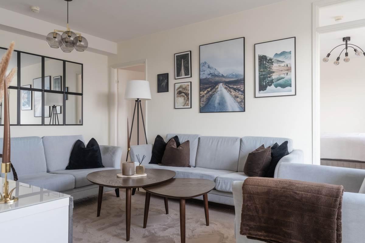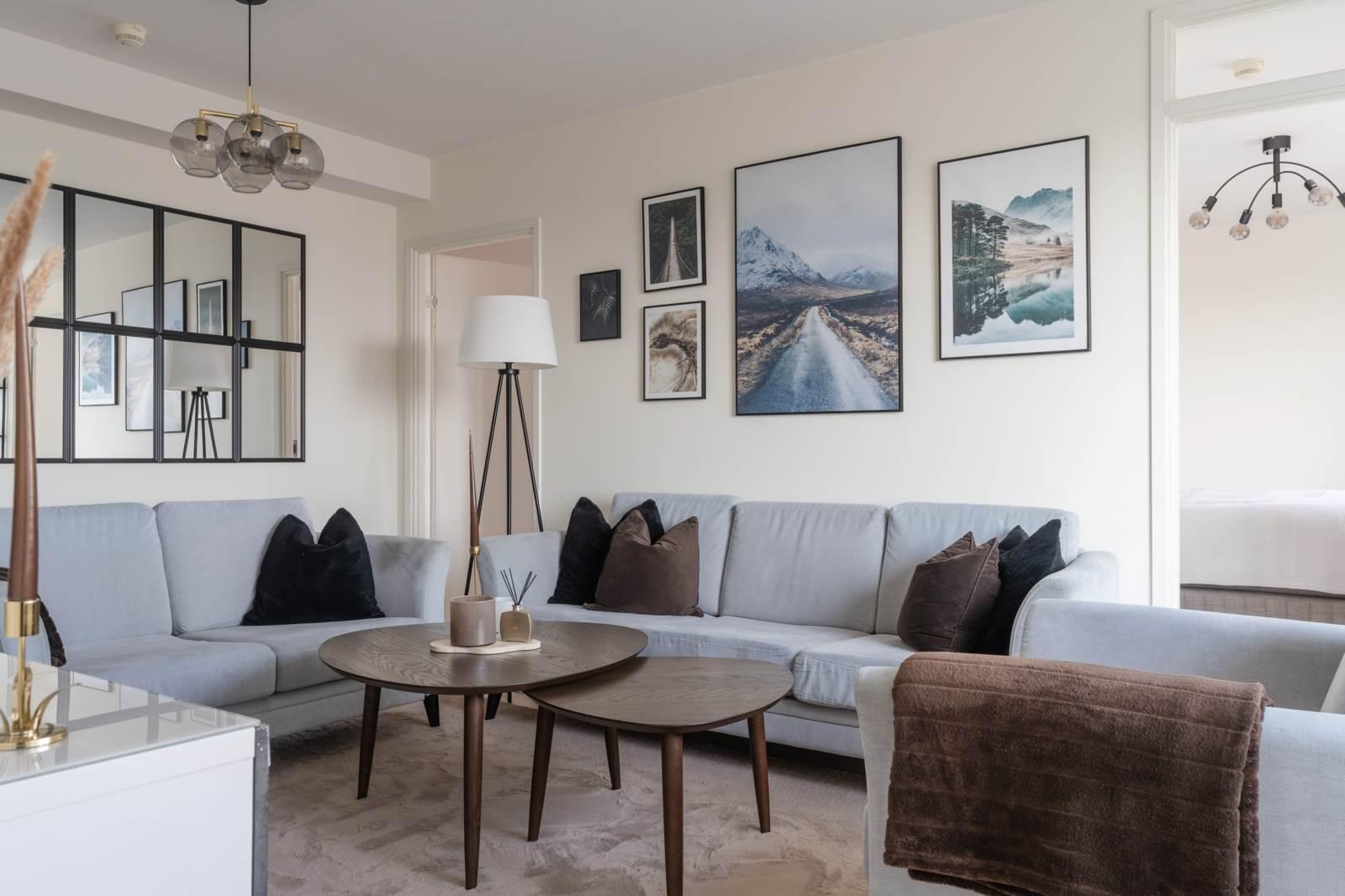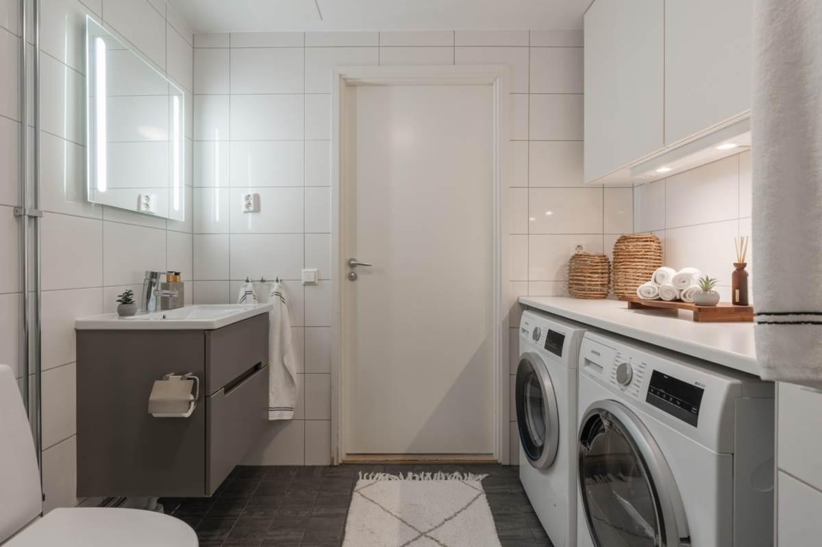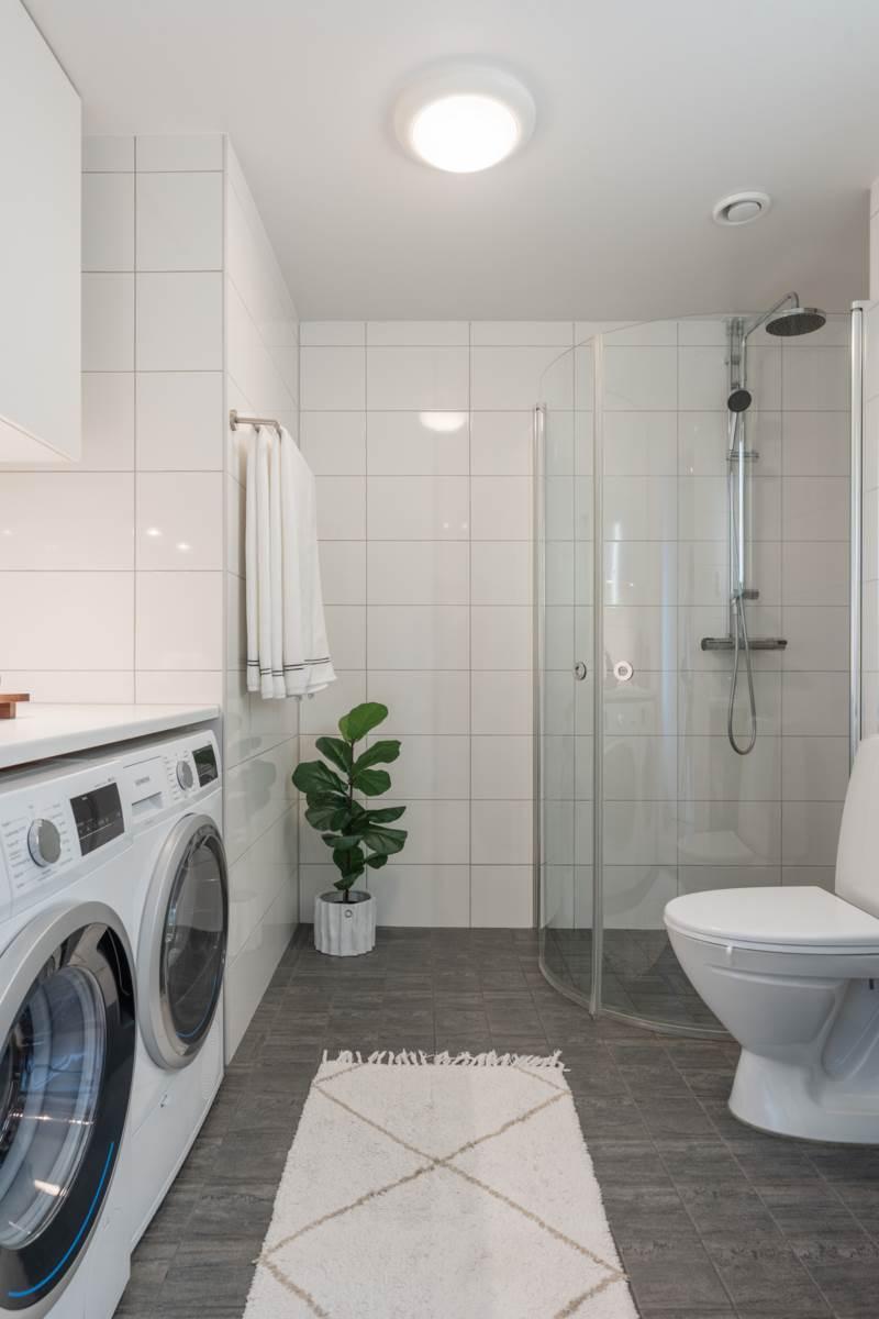 Lägenheten välkomnar dig med en rymlig hall som erbjuder goda förvaringsmöjligheter och ett praktiskt klinkergolv som möter enhetliga och ljusa ytskikt. Det helkaklade badrummet är fräscht och modernt med tvättmaskin och torktumlare, vilket underlättar vardagen ytterligare. Vidare in i bostaden möts du av ett luftigt vardagsrum med plats för både soffgrupp och umgänge. Rummet får fint ljusinsläpp från stora fönsterpartier och har en trevlig känsla av rymd.