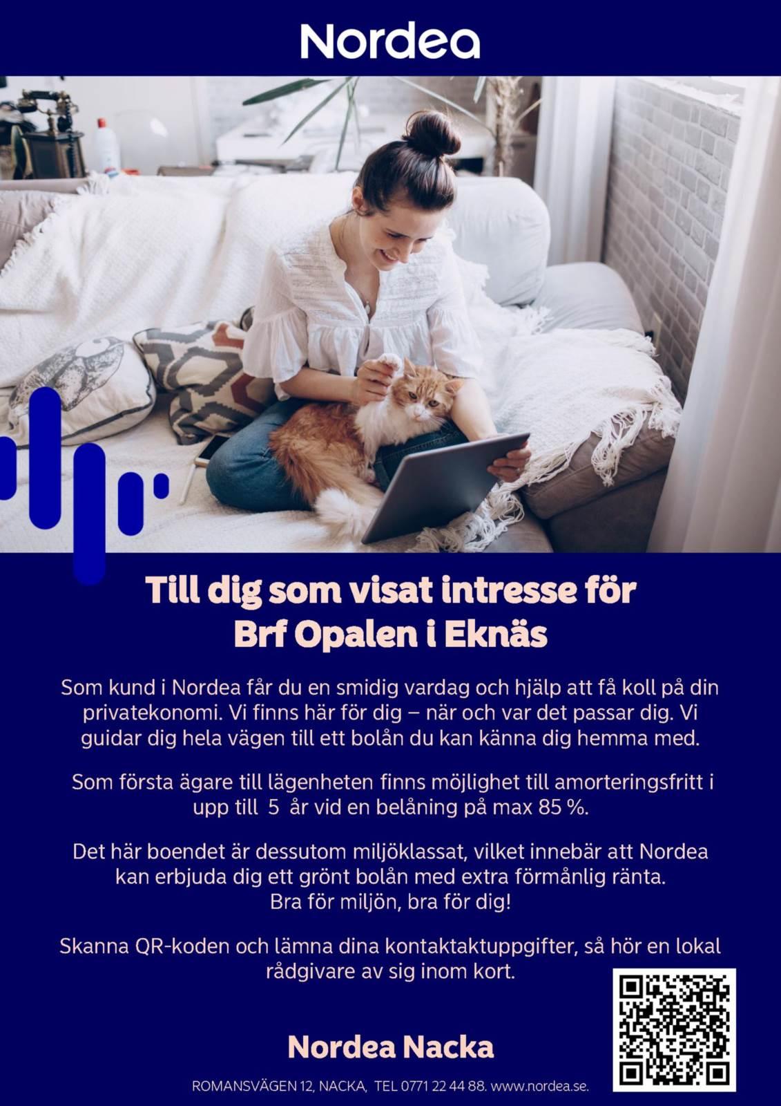 Brf Opalen i Nacka registrerades 2023 och är en äkta förening som äger marken. Den stilfulla fastigheten är byggd i betong i fem våningar med en svart keramisk fasad i skandinavisk design. Den underhållsfria fasaden ger ett mycket exklusivt intryck. Fastigheten rymmer 36 yteffektiva studios om 20-22 kvadratmeter, där varje bostad är genomtänkt för att maximera komfort och funktionalitet.